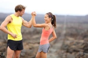 Junger Mann und junge Frau mit blauen T-Shirts joggen nebeneinander mit optimalem Trainingspuls